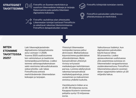 Vuosi 2025 oli edelleen merkittävä kasvuvuosi digitaalisille palveluille. Käyntien määrä palveluissa kasvoi lähes 50 prosenttia edellisvuoteen verrattuna. Valmistauduimme myös aktiivisesti vuoden 2026 alussa voimaan tulleeseen lakiin liikenteen digitaalisista tietopalveluista. Lakimuutos toi Fintrafficille lisätehtäviä liikennetiedon jakelijana ja vahvisti rooliamme liikennetiedon solmukohtana.